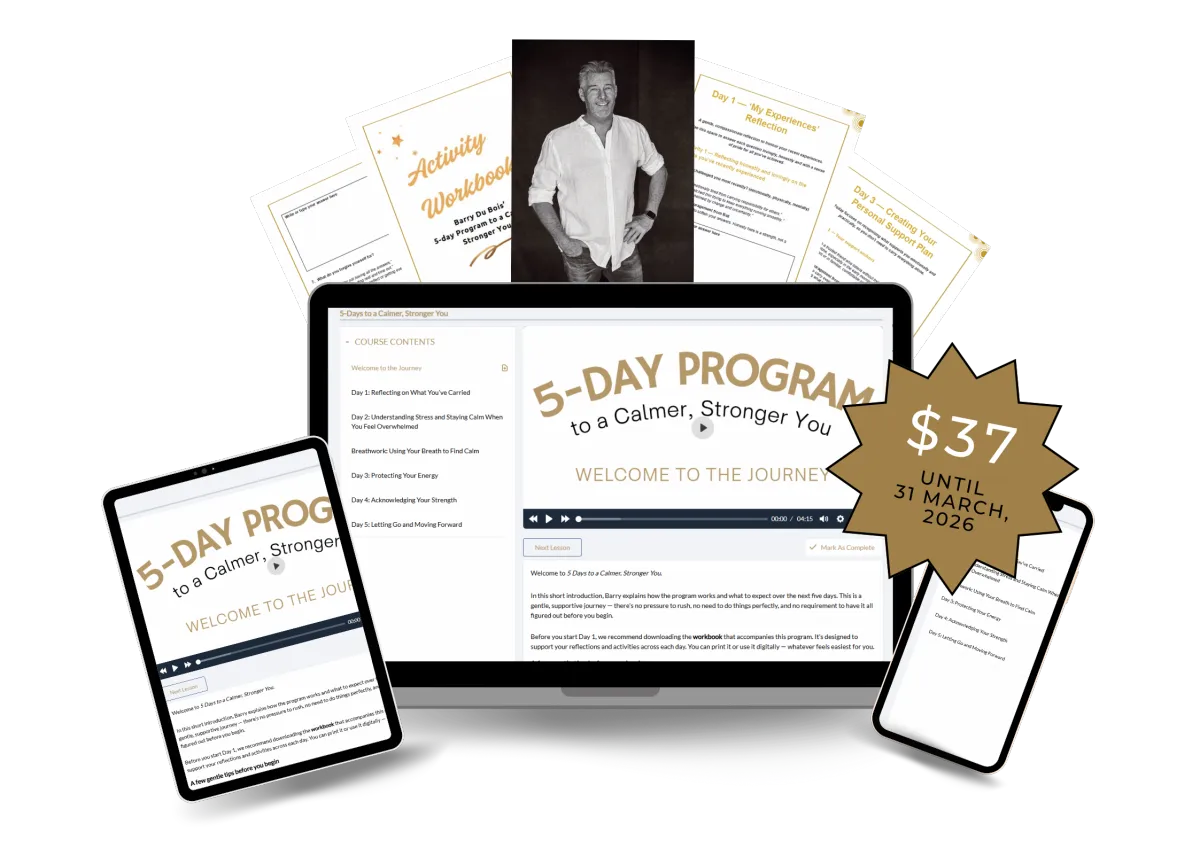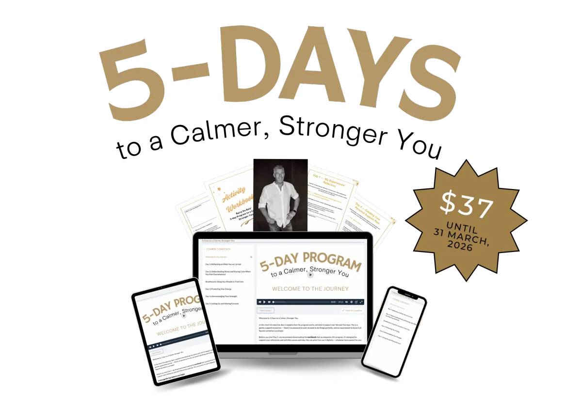 Across five days, Barry guides you through a series of gentle video sessions and simple practices that work with your body and nervous system, not against them. Each day builds on the last, helping you feel more grounded, more settled, and more capable of meeting whatever life is placing in front of you.